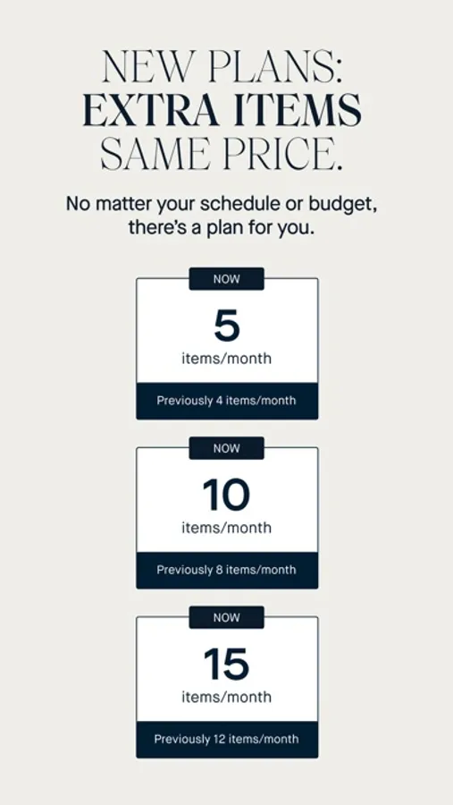 We’ve added extra items to every plan at *no extra cost*. Now with 5, 10, 15, or 20 items per month, our plans let you dress with abandon, every day.