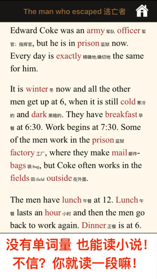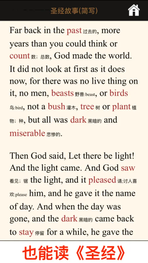我把这些读物中的生词加以标注,目的就是要让你能在几百个常用词的英语海洋中飘浮,直到有一天你会觉得你真的是在这几百个单词的水中自由自在的游玩。那时,你就真的学会英文了。