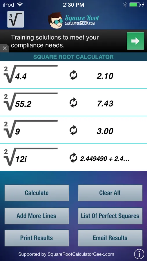 APP will advise you as it calculates if a square root is “perfect”. PERFECT SQUARES are the squares of whole numbers.