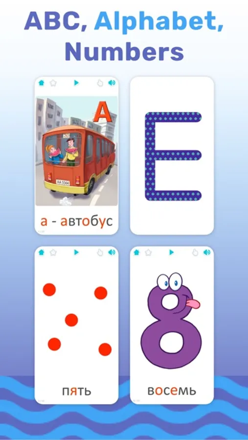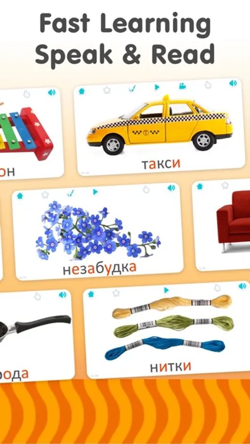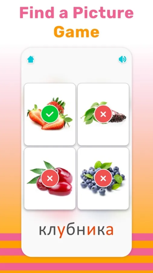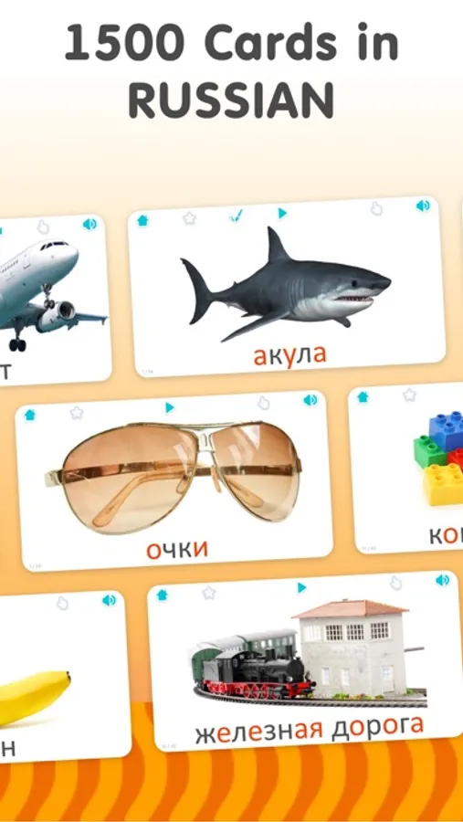 The application has 1500 sound flashcards in Russian language with bright images which are divided into topics and 8 learning games "Find a Picture", "Quiz", etc.