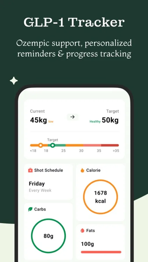 -Comprehensive Health App: Combines calorie tracking, carb management, and GLP-1 support.