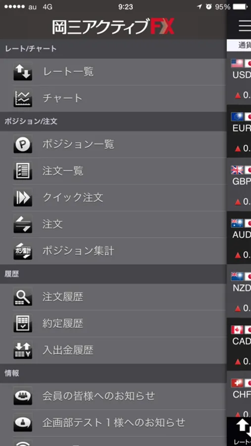 また、レート一覧をワンタップするだけで「チャート」や「クイック注文」「全決済注文」などに素早く移動できます。