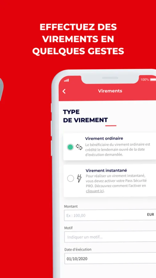 - Effectuer des virements ponctuels ordinaires ou différés unitaires en quelques gestes et ajouter des comptes bénéficiaires si besoin.