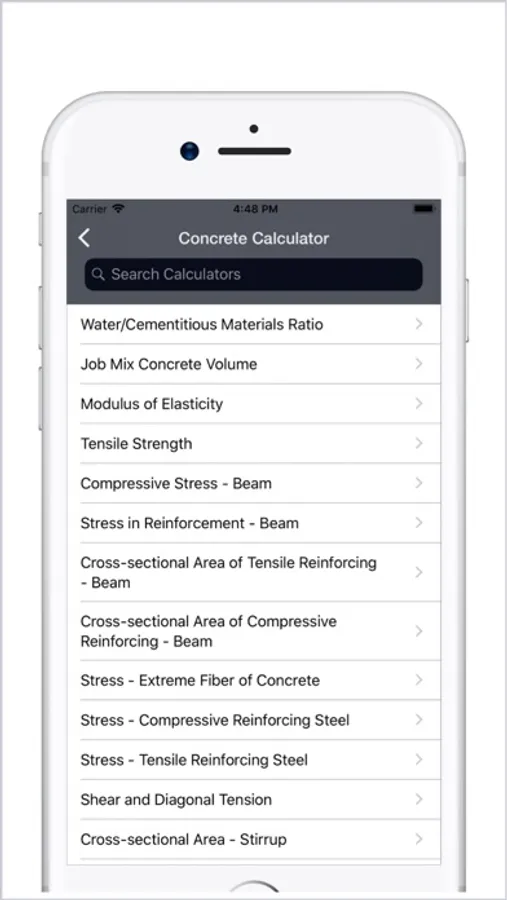 CONCRETE : • Water/Cementitious Materials Ratio • Job Mix Concrete Volume • Modulus of Elasticity • Tensile Strength • Compressive Stress - Beam • Stress in Reinforcement - Beam • Cross-sectional Area of Tensile Reinforcing - Beam • Cross-sectional Area of Compressive Reinforcing - Beam • Stress - Extreme Fiber of Concrete • Stress - Compressive Reinforcing Steel • Stress - Tensile Reinforcing Steel and more... up to 56 Calculators.