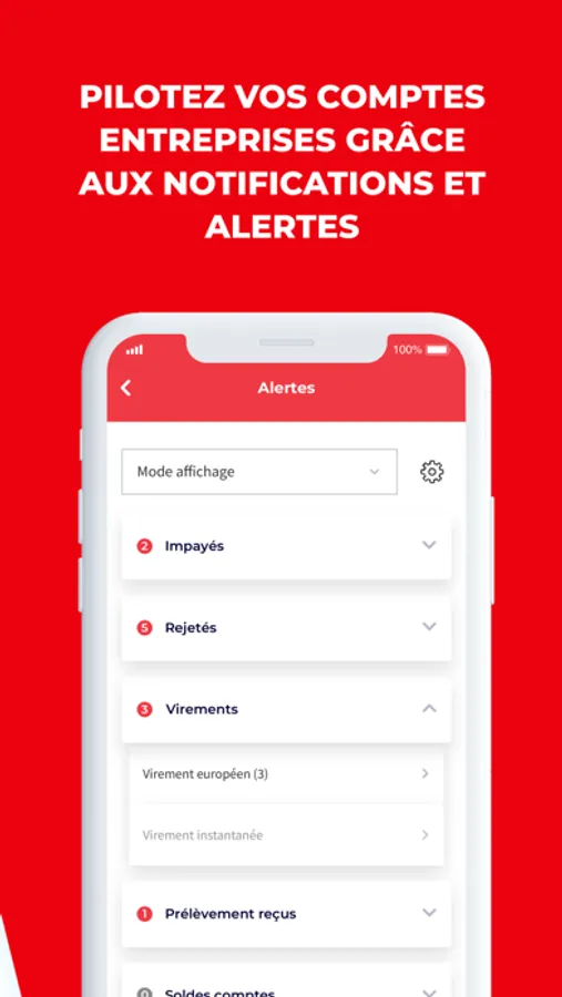 - Soyez notifié des événements clé de votre entreprise que vous avez définis (solde de compte au-dessus d’un seuil fixé, virement reçu, retour d’impayés de toute nature…)