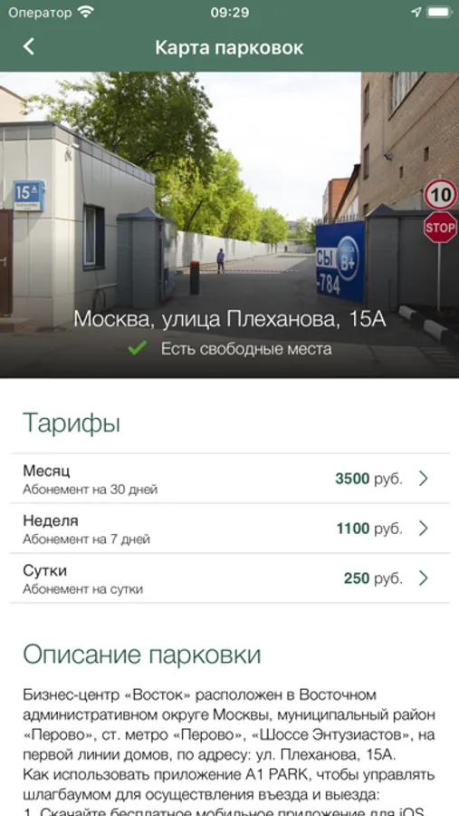 В случае выбора парковки, находящейся под управлением A1PARK, возможно: