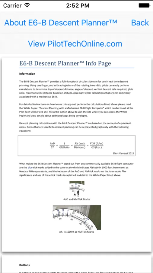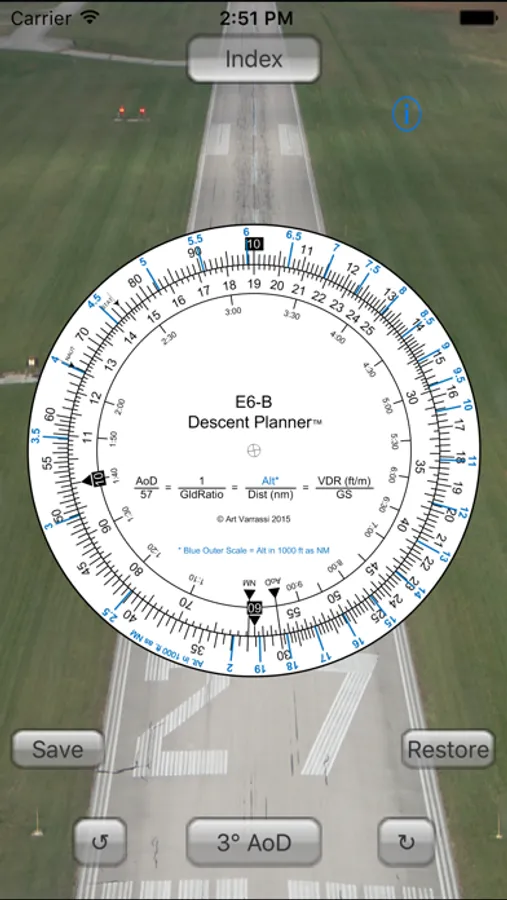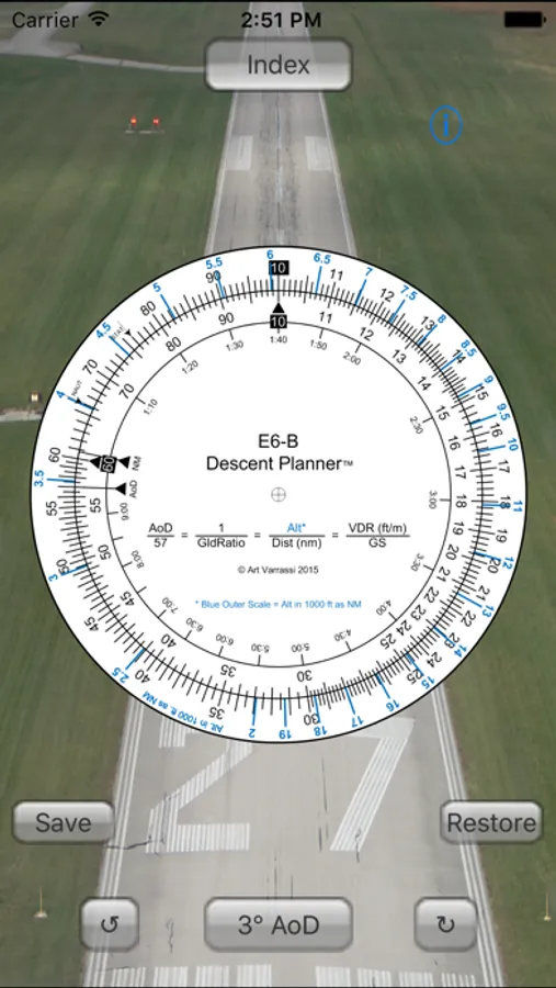 The E6B Descent Planner provides a fully functional circular slide rule for use in real time descent planning. Using one finger, and with a single turn of the rotating inner disk, pilots can easily perform calculations to determine top of descent distance, angle of descent, vertical descent rate required, glide ratio, maximum glide distance based on altitude, plus many other calculations that are not commonly associated with a mechanical E6B.