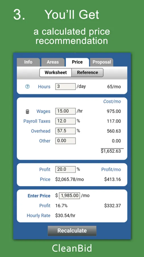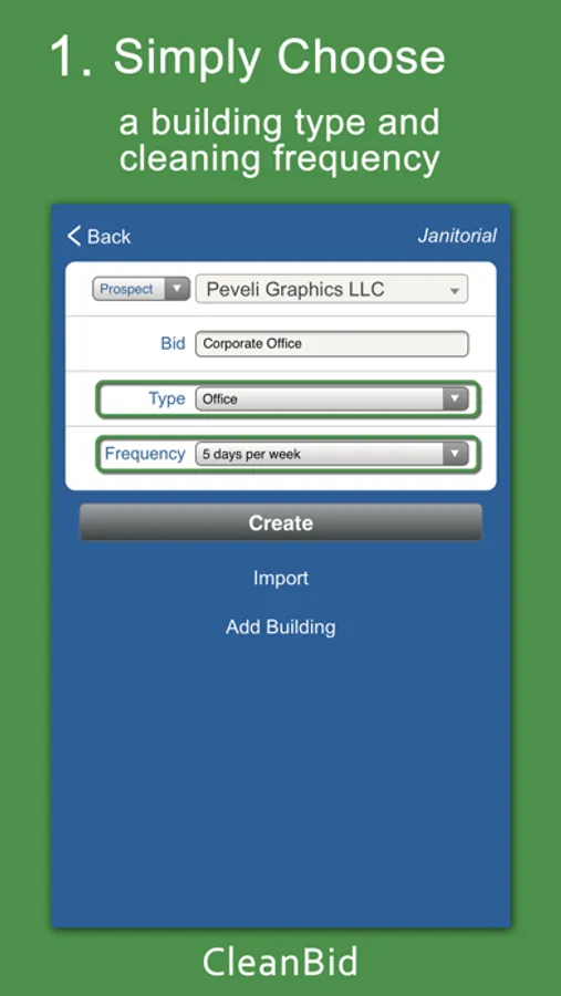 • Fast and Easy! Give the bid a name, pick a building type, choose a cleaning frequency - you’ll get a suggested price and professional proposal.