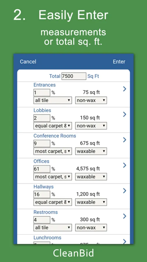 • No Measurements? No Problem. If you have a list of specific measurements you can easily enter them; but, if you don’t, just enter an estimate of the size of the building and our EXPRESS feature will do the rest, loading measurements and cleaning tasks for you – automatically.