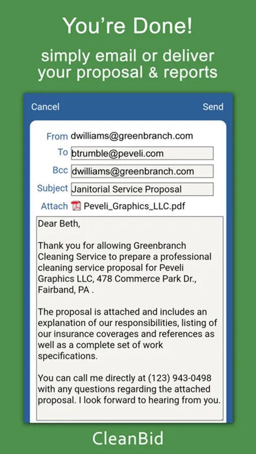 • Customized Bids! You’ll love giving building owners and property managers customized cleaning proposals including your company logo as well as a list of references and detailed job specifications.