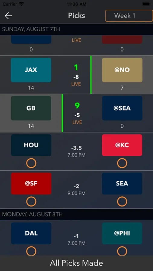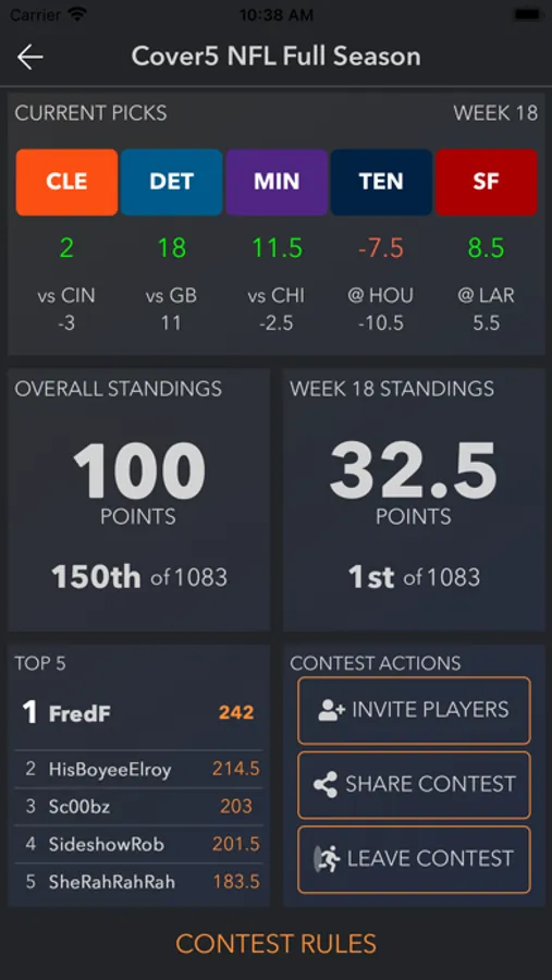 Every point of every game matters with the Cover5 scoring system. We use the Cover5 spread to strike a balance between the favorite and the underdog. You score points based on how much your picks cover or don't cover the spread.