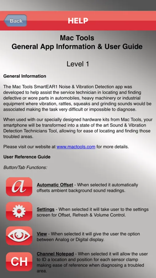 The Mac Tools SmartEAR1 Sound & Vibration Detection app was developed to help assist the service technician in locating and finding defective or worn parts in automobiles, heavy machinery or industrial equipment where vibration, rattles, squeaks and grinding sounds would be associated making the task very difficult or impossible to diagnose.