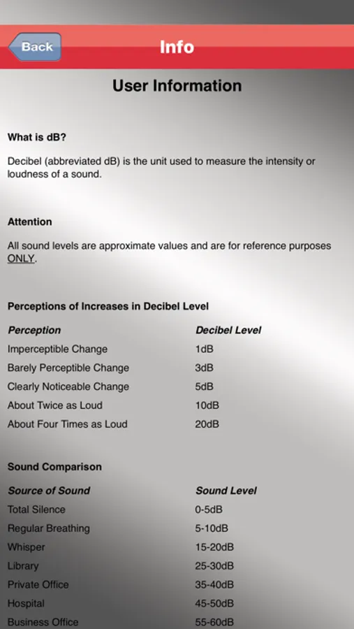 User information guide includes informative facts about sound perception and permissible noise level exposure as well as a sound level comparison reference chart.