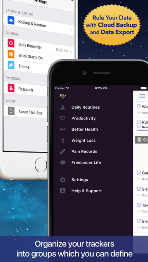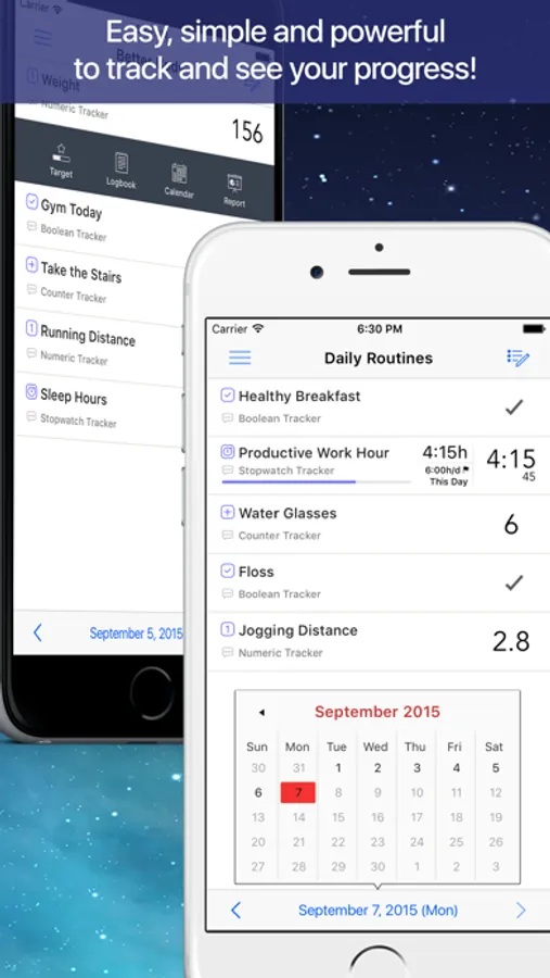 ## Track your daily habits, life goals, healthy routines, weight goal, sleep hours. Use it as habit tracker, goal tracker, counter tracker or even time tracker. Allow to set your goal and see your progress in chart, calendars. Organise them into groups and more.