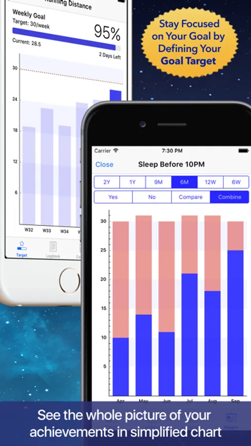 Multiple ways to track your goals from yes/no, counter, numeric to time.