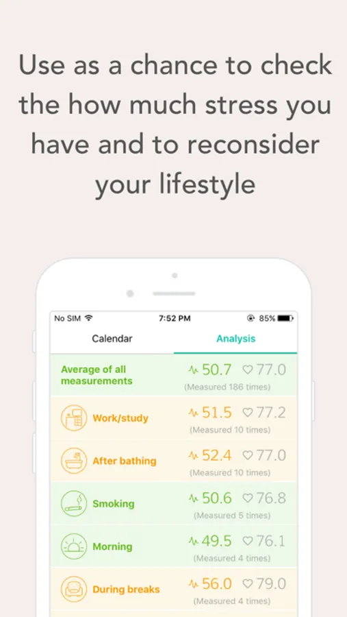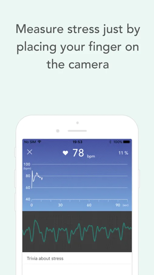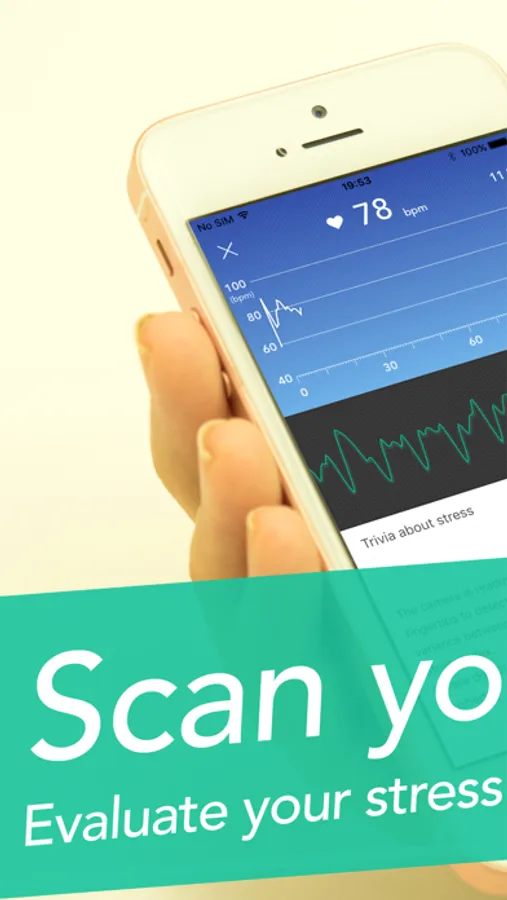 Just place a finger over the camera for two minutes, and StressScan will analyze changes in your heart rate and scientifically measure the level of your mental and physical stress on a scale of 1 to 100.
