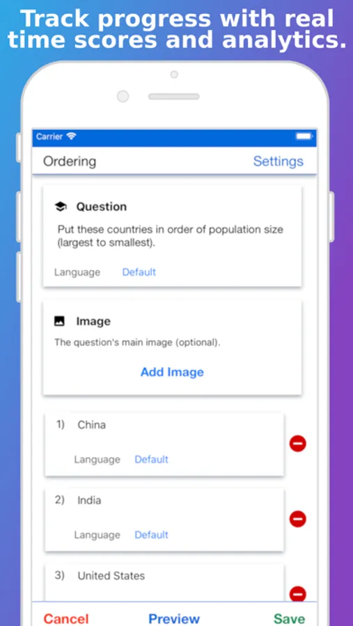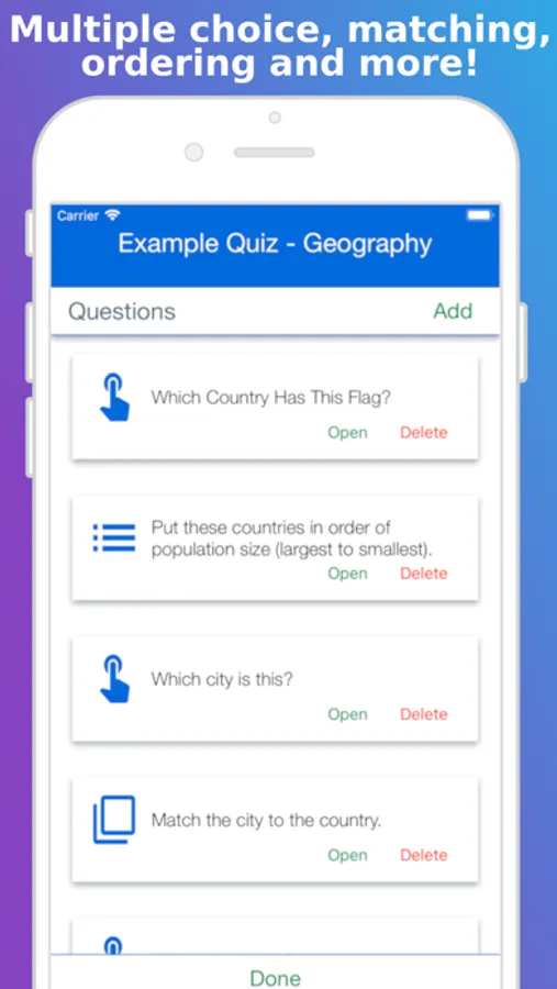 • Choose from 5 question types, including multiple choice, ordering & matching