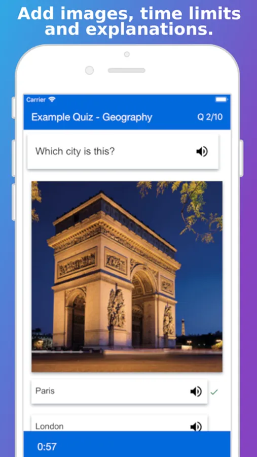 You can create and play an unlimited number of quizzes for free with this app. The app features an optional upgrade of standard accounts to professional accounts. This allows users to back-up and share quizzes across Apple and other mobile platforms as well as online. The professional account also works across our other study apps.