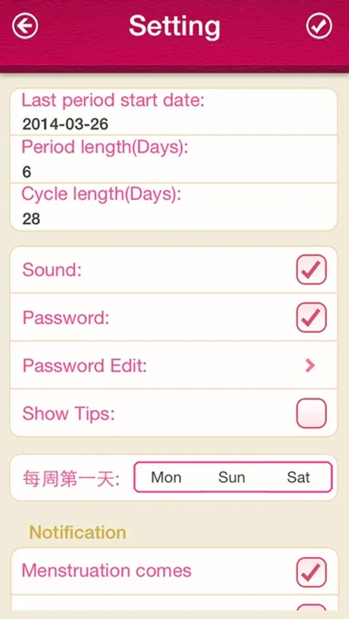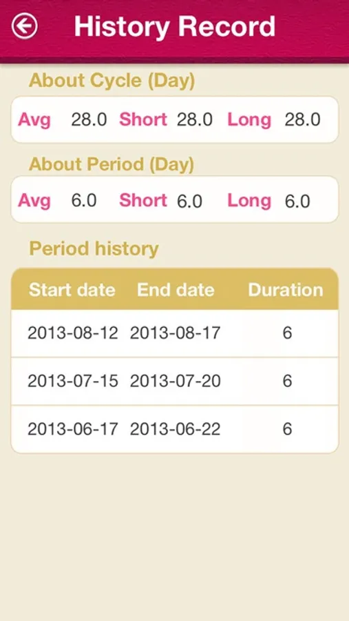 4. Can be set for each menstrual cycle according to the actual, you can view the historical record and compute the average cycle data.