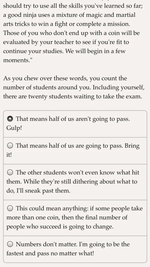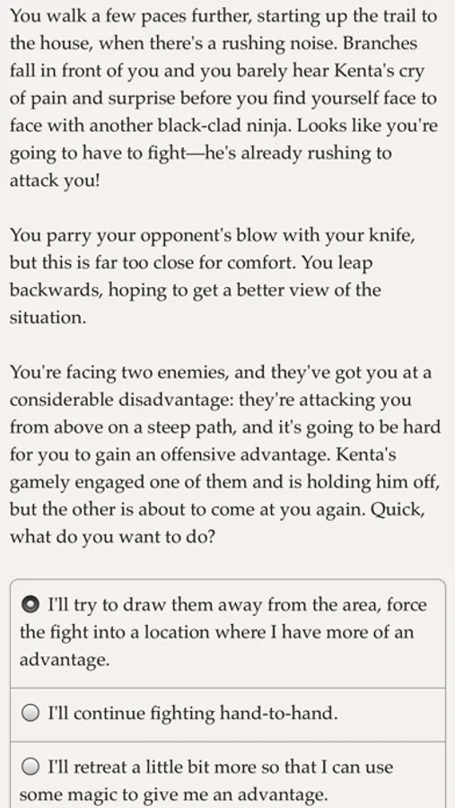 Choice of the Ninja is an epic interactive fantasy novel by Katherine Buffington, where your choices determine how the story proceeds. The game is entirely text-based--without graphics or sound effects--but driven by the vast, unstoppable power of your imagination.