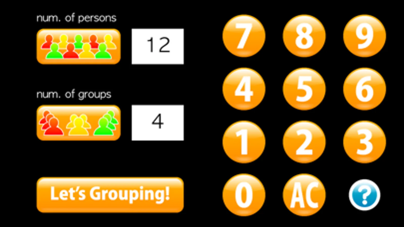 Grouping Now is an application program that divides from 2 to 100 members into two or more groups at random.
