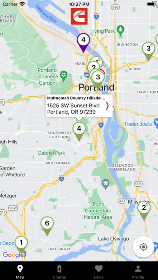 The Cummins smartphone application lets users locate electric vehicle charging stations through a searchable map with GPS capability and pay for charging on those stations with an Cummins account. The map enables users to view the status and availability of Cummins managed chargers near their current location. Once a charging station is selected, driving directions are offered. Also, stations can be saved to the user’s favorites, allowing quick and easy access to the stations they use the most.