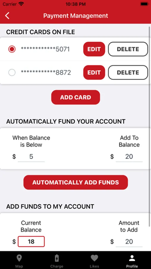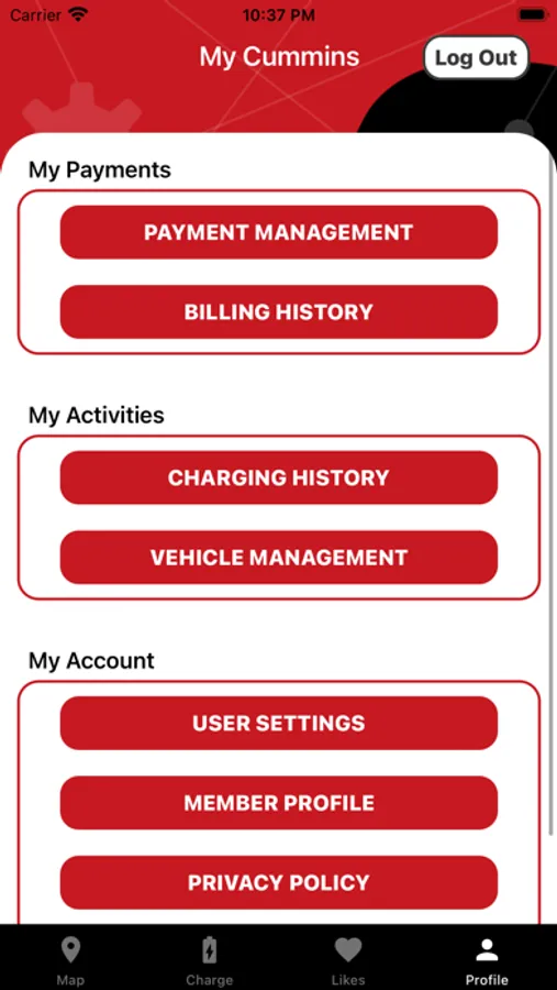 Additional features include viewing charging session and billing history, managing payment cards, and editing their profile for Cummins members