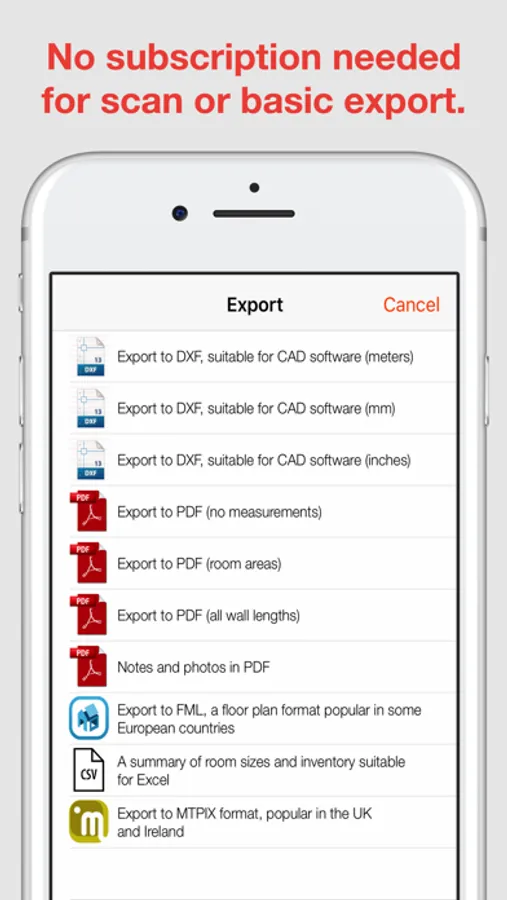 Export, saving, sending and printing of your plans as standard image files is free. Unlock RoomScan Classic with an annual auto-renewable subscription for unlimited export in PDF, DXF, FLYPLAN®, 3D models and other formats. Payment will be charged to iTunes Account at confirmation of purchase. Subscription automatically renews unless auto-renew is turned off at least 24-hours before the end of the current period. Account will be charged for renewal within 24-hours prior to the end of the current period. Subscriptions may be managed and auto-renewal may be turned off by going to your iTunes Account Settings after purchase. Any unused portion of a free trial period will be forfeited if you purchase a subscription.