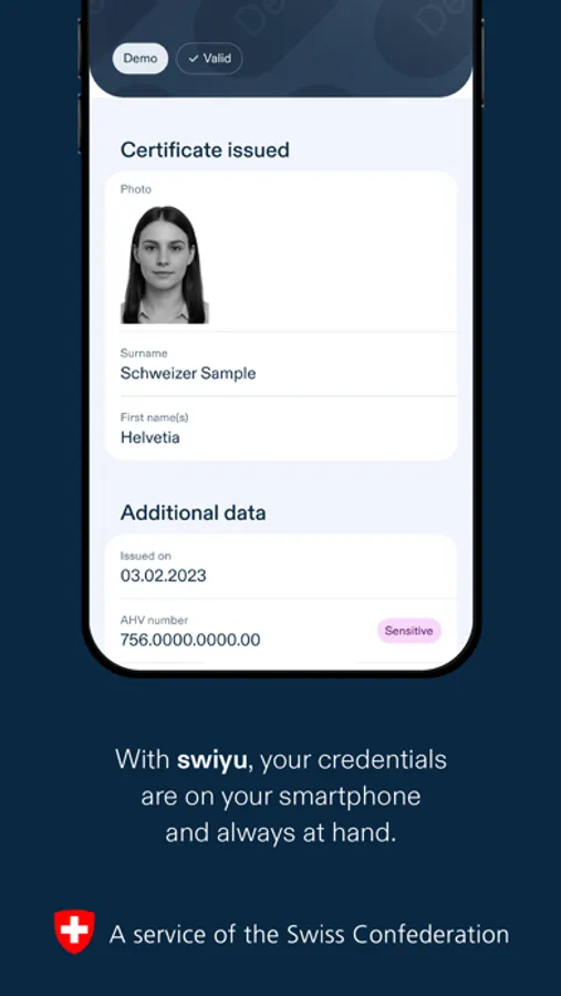 It is expected that from 2026 swiyu will enable you to have your e-ID and other digital credentials with you at all times. swiyu is designed to give you the greatest possible control over your data and to use it sparingly.