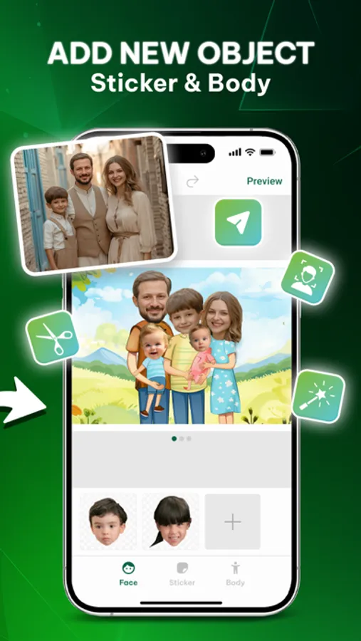 Family Photo app also includes a wide array of stickers and body options. With these additions, you can enhance each family picture in unique ways, adding personality and style to your family collage. These features make it easy to make each family picture stand out.