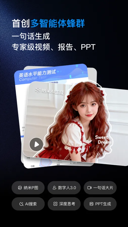 纳米AI ,首创多智能体蜂群,一句话生成专家级视频、报告、PPT。