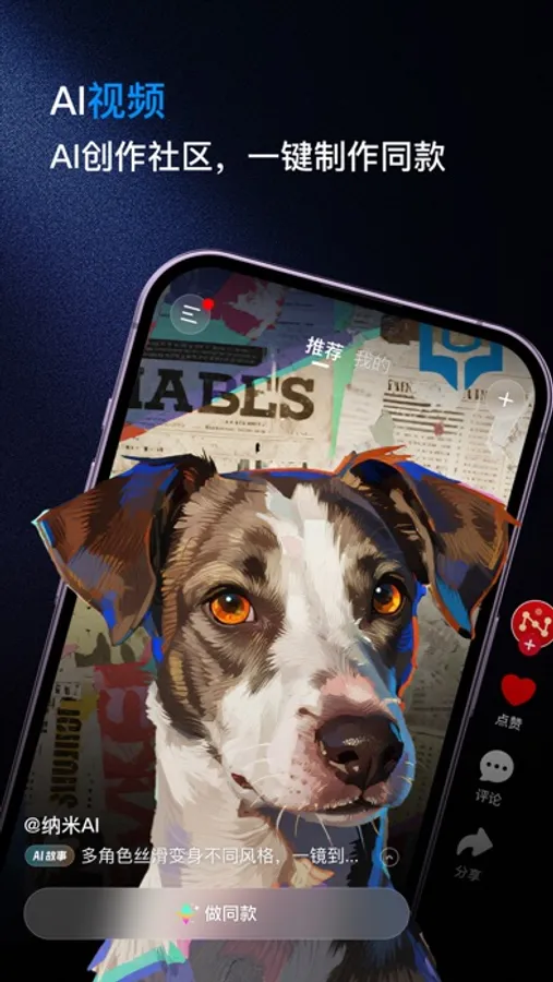 - AI创作:只需讲一句话,就能生成精美的图片,各种风格任意挑选,让你的创意跃然眼前。支持上传图片,一键生成视频,让你的照片活起来,随时随地发挥创意。