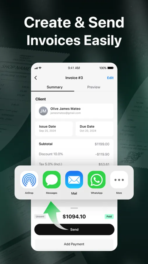 • Export invoices in PDF or images and send them via Mail, Messages, WhatsApp, and more