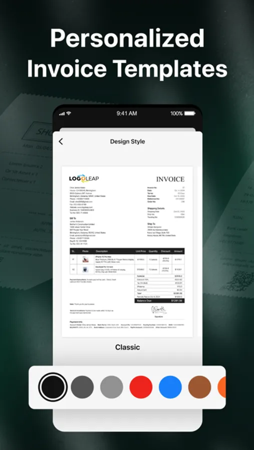 Elevate your invoice with customizable templates that reflect your brand's professionalism, enhance your credibility, and build confidence in your clients. Choose from diverse styles and color schemes to perfectly match your brand and impress your clients.