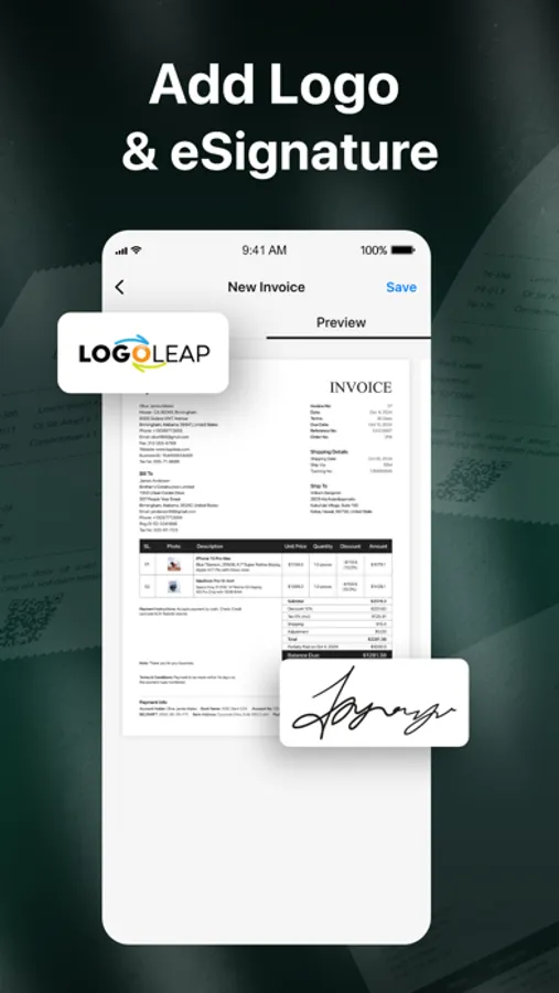 Quickly add regular clients by entering their names, emails, company details, phone numbers, and tax numbers, or import their info directly from your contacts. Also, create and save item details, including descriptions and photos, for a comprehensive inventory and enhanced client interactions.
