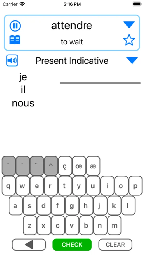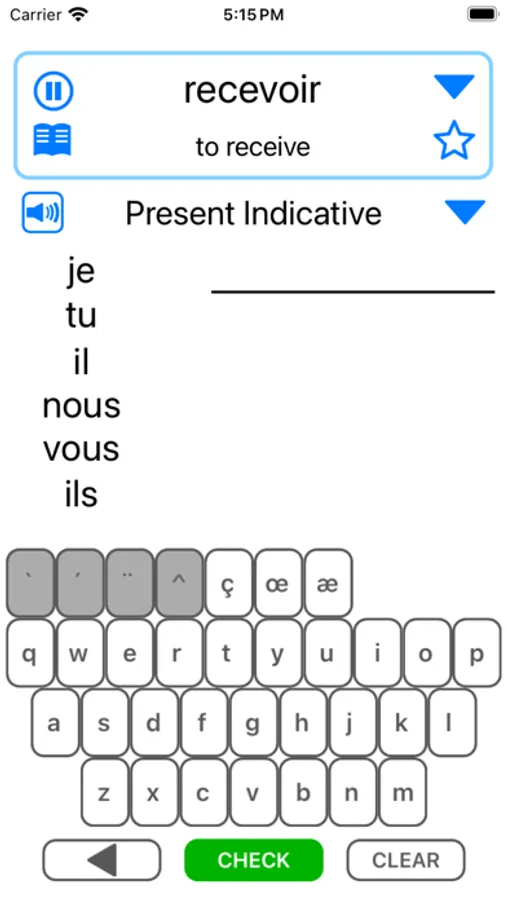 This is a French verb learning application with a simple design. The questions focus on irregular verbs. This app allows you to learn verb conjugations with the exception of compound tenses. Enter the correct answer and touch the check button.