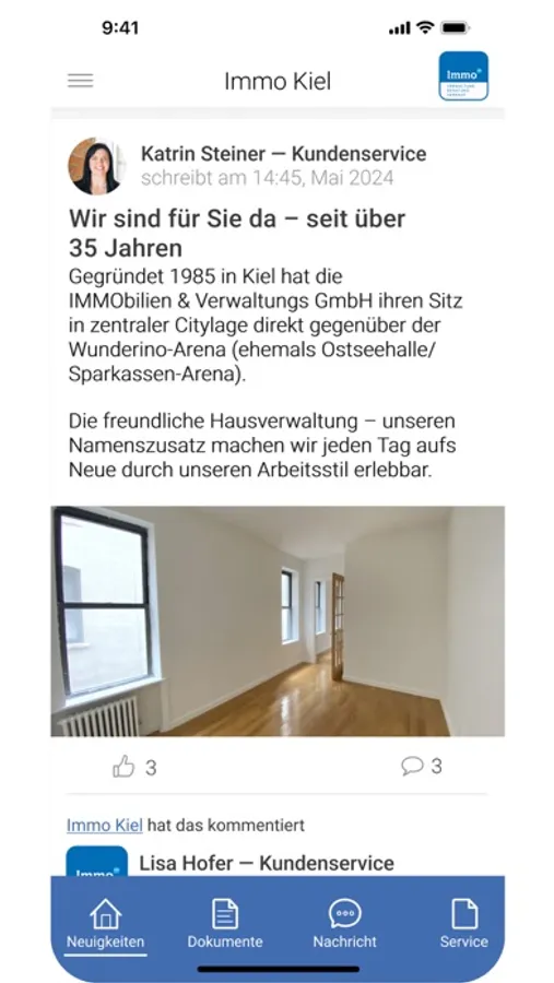 - Transparent: Dokumentation ist für uns die “halbe Miete”. Mit der Immo Kiel App erhalten Sie alle wichtigen Informationen zu Ihrer Liegenschaft direkt am schwarzen Brett und können diese kommentieren.