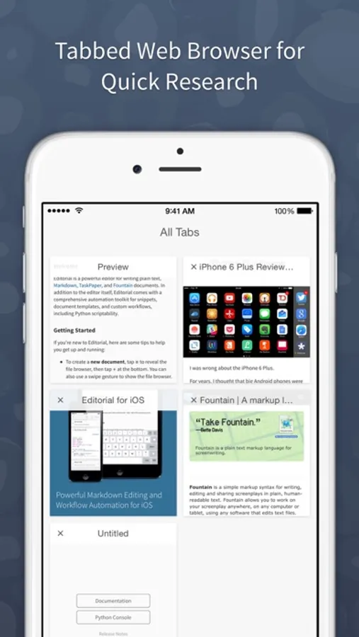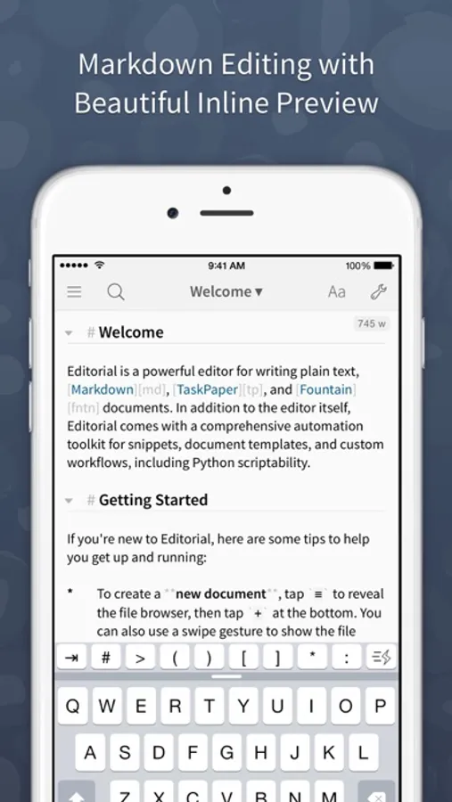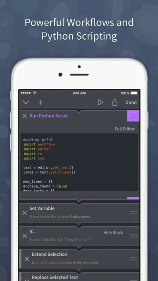 * Extensible with Workflows and Scripts – Select from over 50 text processing actions to create your own workflows for extending Editorial's feature set. For even more advanced automation, you can write Python scripts with an integrated code and UI editor.