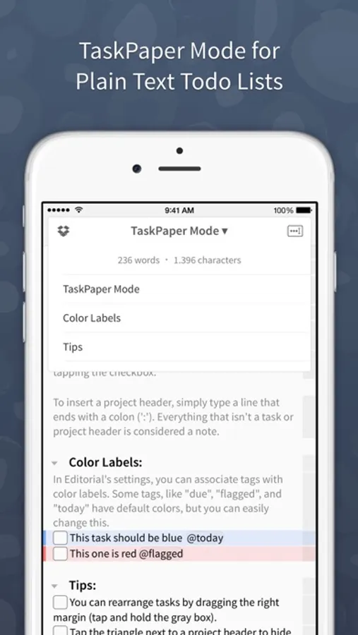Editorial is a plain text editor for iOS with powerful automation tools and a beautiful inline preview for Markdown, TaskPaper, and Fountain documents.