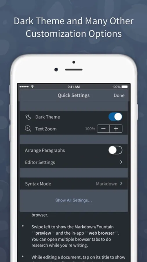 * Smart Keyboard – The extended keyboard was specifically designed for writing Markdown and includes all the special characters you need. You can also control the cursor with simple swipe gestures.
