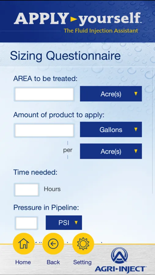 Apply Yourself comes pre-loaded with the complete range of injection pumps from Agri-Inject. This app allows a grower to easily enter the specific data points about their application (field size, irrigation timing, injected liquid type and rate) then it outputs a ranked list of the best pumps that would fit that application.