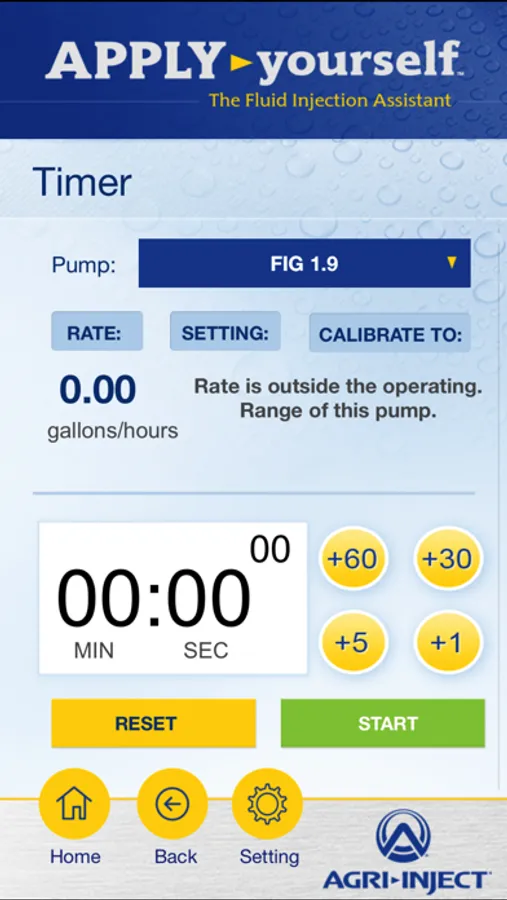 Apply Yourself makes calibration a snap. Select your pump, enter in the basic details of your application, and this application immediately gives the proper setting of the pump and the amount of liquid product that pump should deliver during calibration. Additionally, Apply Yourself provides you with a handy timer function to time your calibration event, all the while showing you the exact target volume you are trying to hit.