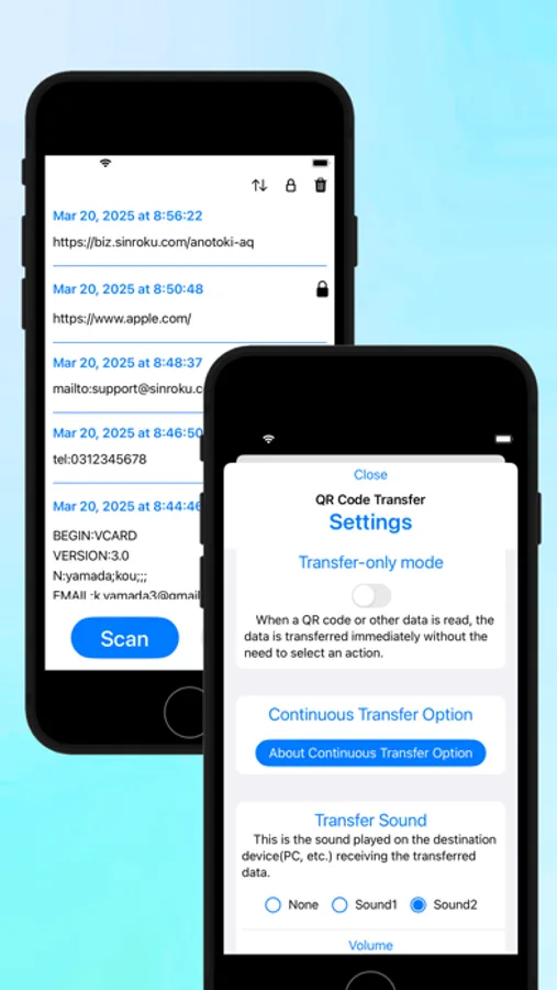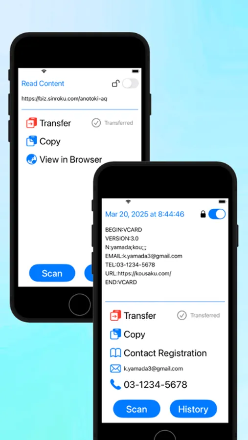 The data you have scanned can be redisplayed by tapping "History". Transfers and app launches are also possible.