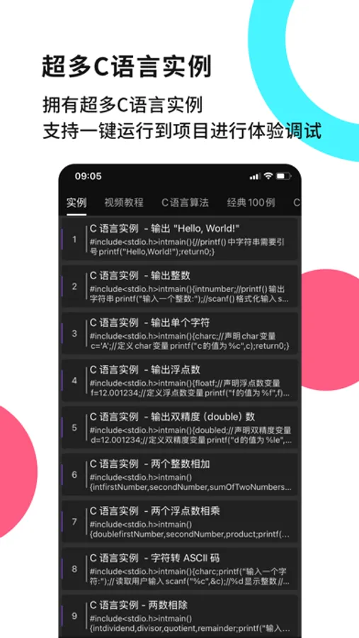 4. C language instance: Has a large number of C language examples, detailed principle introduction, support for one-click operation debugging, is a good helper for C language beginners;