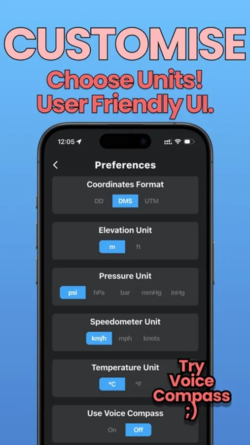 You can also choose the units for each measurement. For example, for current location, you can choose latitude and longitude (DMS), decimal degrees (DD), and UTM (or Universal Transverse Mercator).