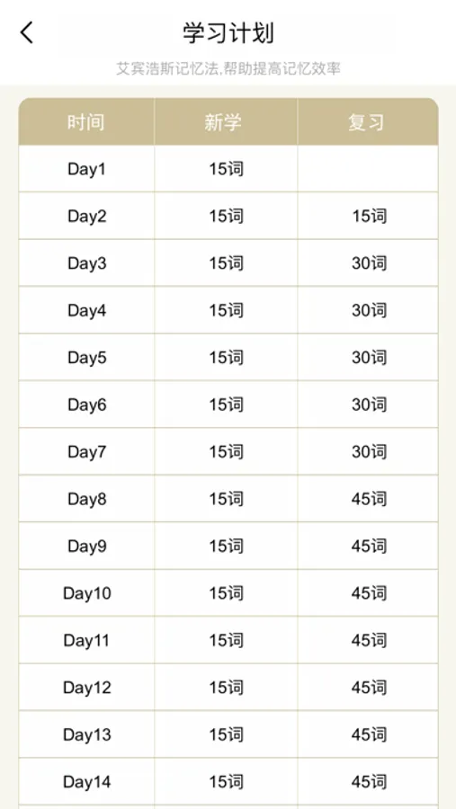 按照艾宾浩斯记忆方法,智能规划复习,精准高效的抗遗忘策略,科学分配每日单词背诵任务,按要求完成“新学“”复习“”练习“打卡任务。