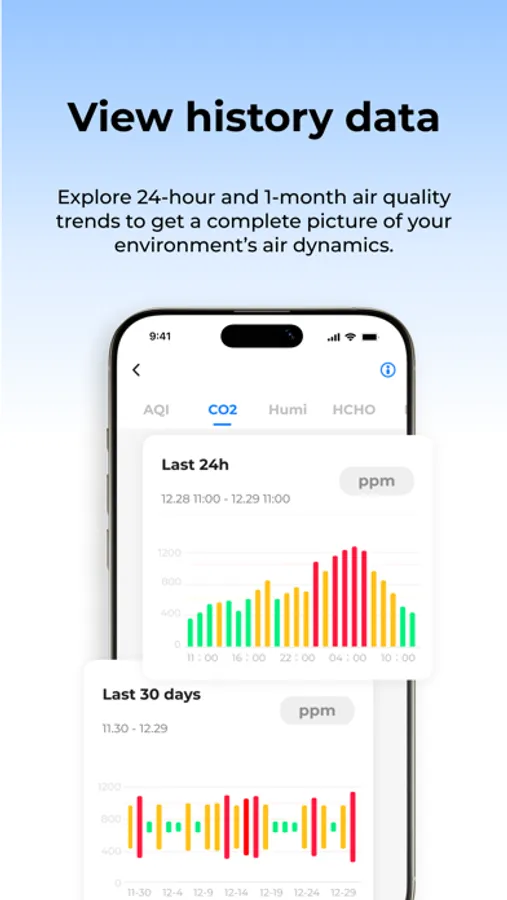 Explore 24-hour and 1-month air quality trends to get a complete picture of your environment’s air dynamics.