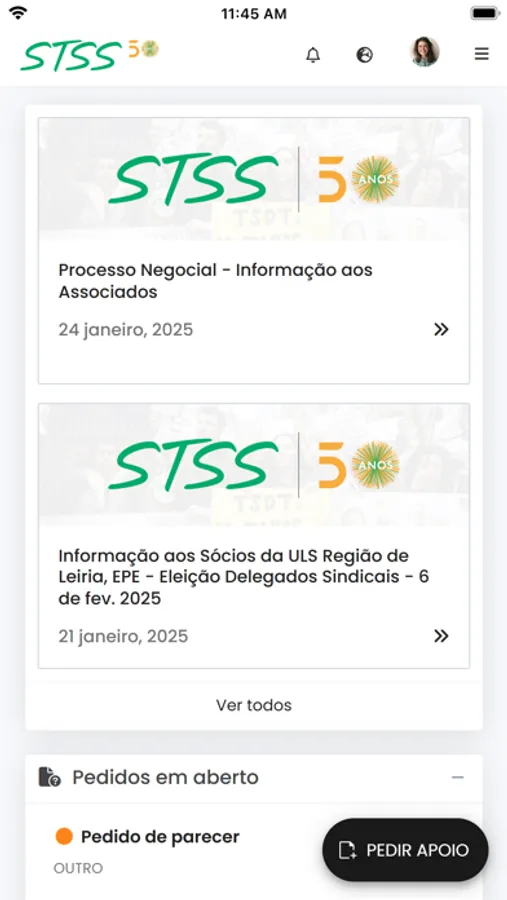 - Pedidos de Apoio: submissão de questões pelos associados diretamente na plataforma e respondidas pela mesma via, permitindo assim um acompanhamento mais fácil dos processos.