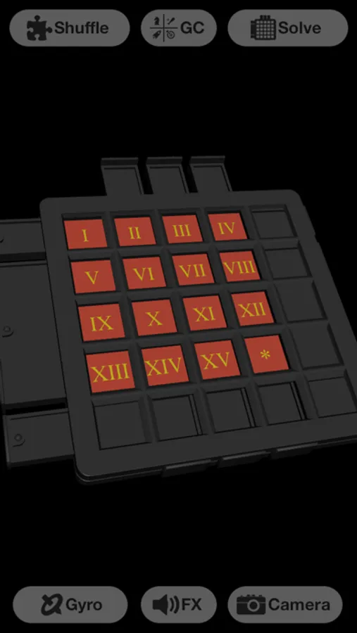 On the front side, 15 of 17 tiles are numbered in roman numbers 1-15, one has an asterisk and one is black. On the back side, the tiles are numbered in arabic numbers from 0-15, where 0 occurs twice.