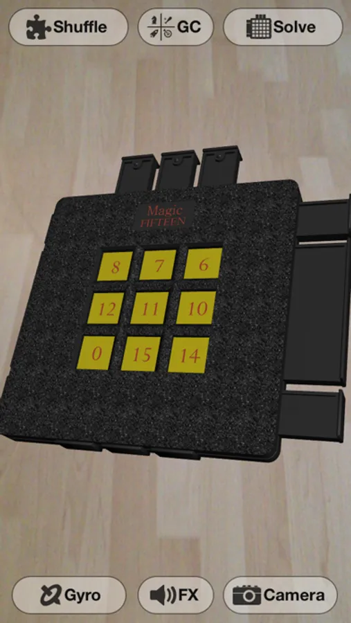 Magic Fifteen is a two-sided sliding piece puzzle, consisting of 17 tiles in a 5x5 square. The middle three columns have vertical sliders moving 4 tiles up and down. Horizontally again three sliders are in place, the top and bottom ones in the first and last row also moving 4 tiles and the middle slider, spanning three rows, moving 3x4 tiles left and right. The top horizontal slider will only move, if all vertical sliders are up and the bottom horizontal slider only moves, if all vertical sliders are down.